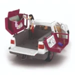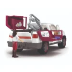 De set bestaat uit een robuuste witte en kastanjebruine pick-up truck met functionerende deuren die open kunnen, zodat de dierenarts kan instappen en naar het volgende noodgeval kan rijden.